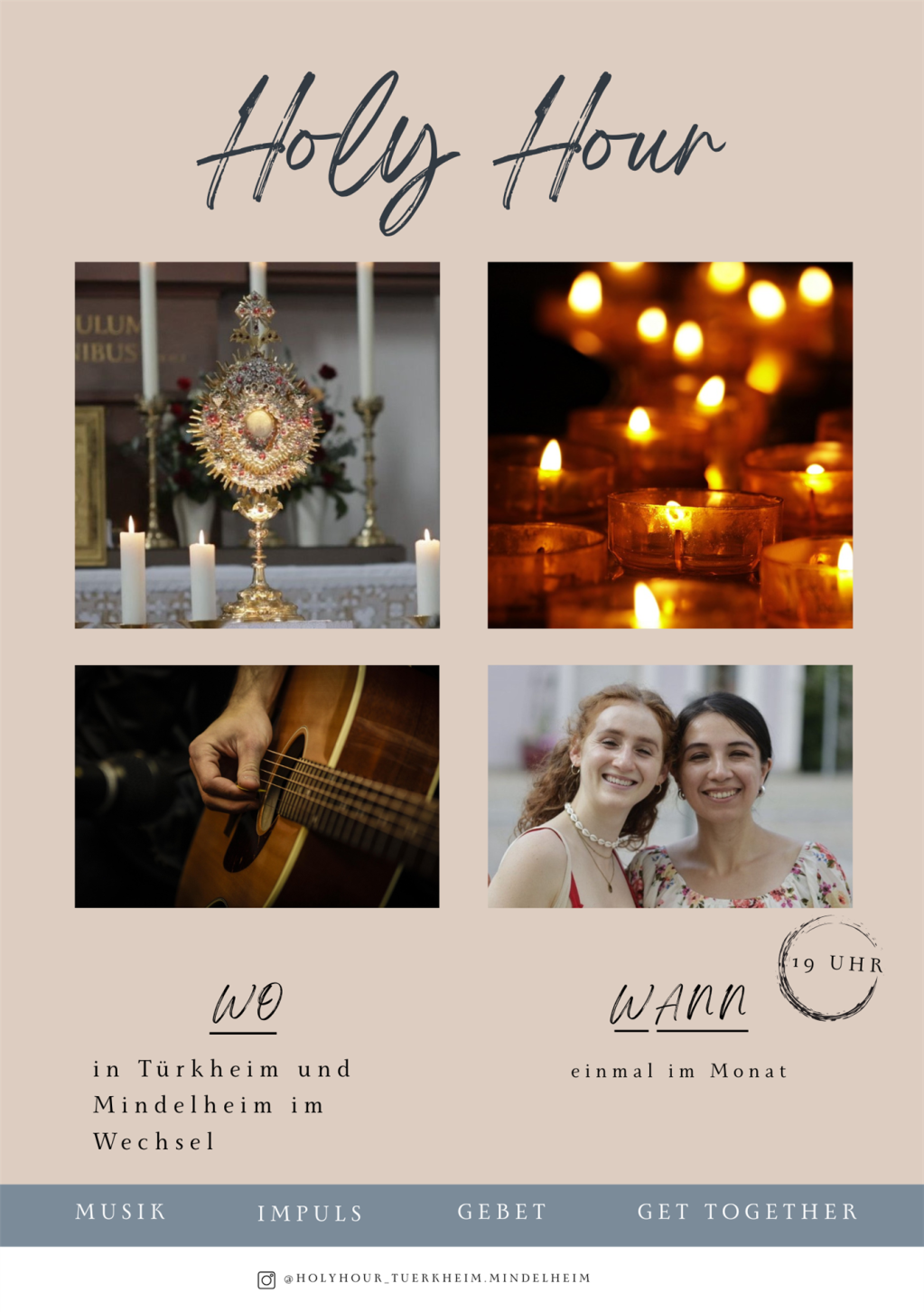 Die Holy Hour ist ein Ort, an dem wir gemeinsam die Schönheit des Glaubens erleben! Eine Stunde gestalteter Anbetung durch die jungen Erwachsenen der Pfarreiengemeinschaft. Kommt vorbei und bringt gerne eure Freunde und Familie mit! Alle Altersgruppen sind herzlich willkommen. Die aktuellen Termine findet ihr links im Flyer - wir sind abwechselnd in Türkheim und Mindelheim. Folgt uns gerne auf Instagram, um up-to-date zu bleiben, oder tretet unserer Whatsapp-Gruppe bei.