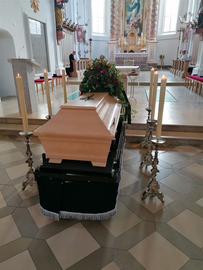Manchmal taucht die Frage auf, ob der Sarg oder die Urne auch in der Kirche sein dürfen. In der ganzen Liturgie beten wir für den Verstorbenen. Umso schöner und stimmiger ist es deshalb, wenn der Verstorbene auch leiblich anwesend ist und er auch im Kirchenzug von der Gemeinde zum Friedhof begleitet werden kann.