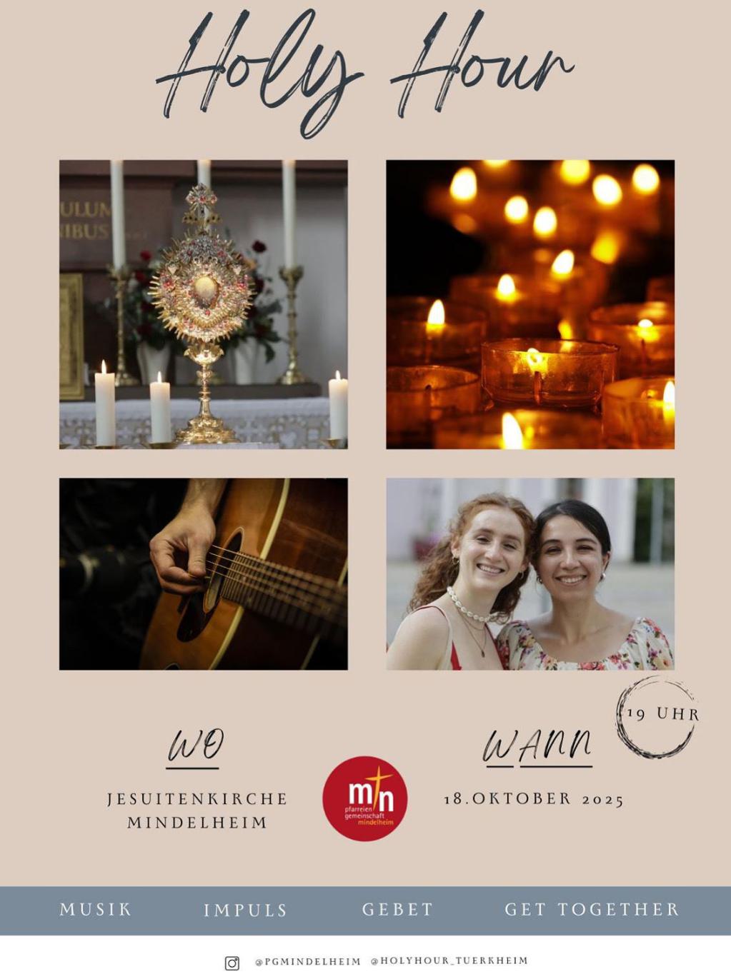 Die Holy Hour ist ein Ort, an dem wir gemeinsam die Schönheit des Glaubens erleben! Eine Stunde gestalteter Anbetung durch die Jugend der Pfarreiengemeinschaft. Kommt vorbei und bringt gerne eure Freunde und Familie mit! Die aktuellen Termine findet ihr links im Flyer - wir sind abwechselnd in Türkheim und Mindelheim. Folgt uns gerne auf Instagram, um up-to-date zu bleiben, oder tretet unserer Whatsapp-Gruppe bei.